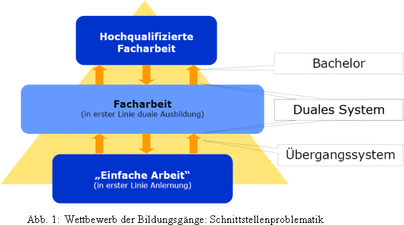 Das duale System der Berufsausbildung steht daher vor grundsätzlichen Herausforderungen: Es muss zum einen gegenüber Hochschulstudiengängen konkurrenzfähig bleiben und zum anderen zu akademischer Weiterbildung anschlussfähig sein (WEBER 2008a).