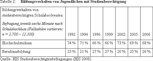 Aktuelle Zahlen zeigen keine Verschiebung des Bildungsverhaltens studienberechtigter Jugendlicher zugunsten der Aufnahme eines Studiums. Weiterhin entscheiden sich rund ein Viertel der Schulabgänger für eine Ausbildung im dualen System (vgl. Tabelle 2).