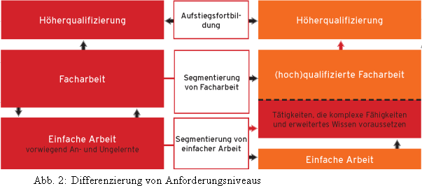 Die Branchenbeispiele zeigen, dass sich die Tätigkeiten und Anforderungen über alle Qualifikationsniveaus hinweg verändern. Die betrieblichen Einsatzfelder und die jeweiligen Qualifikationsanforderungen lassen die Grenzen zwischen Anlerntätigkeiten und Facharbeit nicht länger eindeutig bestimmen. Diese De-Segmentierungsprozesse in Bezug auf die Anforderungen, welche die Arbeitsaufgaben an Wissen, Können und personelle Kompetenzen der Beschäftigten stellen, verlaufen in den Bereichen der Facharbeit und der Einfacharbeit jeweils in beide Richtungen: Sowohl nach unten im Sinne abnehmender Anforderungen als auch nach oben im Sinne steigender Anforderungsniveaus. Bislang weitgehend homogene Anforderungsniveaus, die relativ eindeutig den Aufgabenbereichen und Tätigkeitsfeldern ausgebildeter Facharbeiter auf der einen und an- und ungelernter Kräfte auf der anderen Seite zuzuordnen waren, spreizen sich auf und überschneiden sich. Eine im Herbst 2006 und Sommer 2007 schriftlich durchgeführte Befragung des f-bb von 194 Unternehmen der Metall- und Elektroindustrie in Bayern und Berlin-Brandenburg hatte ergeben, dass es in mehr als jedem zweiten der befragten Betriebe ein entsprechendes Anforderungssegment gibt.
