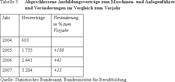 Um der Differenzierung der Anforderungsniveaus in den Betrieben auch auf Seiten des Bildungssystems zu entsprechen, wurden zweijährige Berufe geschaffen oder modernisiert. Dadurch sollte die Ausbildungsbereitschaft der Betriebe erhöht werden und zusätzliche Ausbildungsplätze entstehen. Das im Vergleich zu den dreieinhalbjährigen Ausbildungsberufen geringere Anforderungsniveau zielte zudem auf die bisher außen vor gebliebenen Bewerber um einen Ausbildungsplatz, in erster Linie also auf Jugendliche mit Hauptschulabschluss. Ein solcher Beruf ist der im Jahr 2004 eingeführte Maschinen- und Anlagenführer. Das f-bb führte in Bayern eine Begleituntersuchung der Einführungsphase durch, ausgewählte Ergebnisse werden hier vorgestellt (GRUBER/ WEBER et al. 2007).