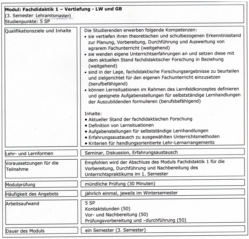 Das neue Konzept der lehramtsbezogenen Bachelor- und Masterausbildung zeichnet sich dadurch aus, dass der Anteil an Fachdidaktiken und Erziehungswissenschaften sowie unterrichtspraktischen Übungen deutlich gestiegen ist. Weiterhin sind die Modulbeschreibungen kompetenzorientiert erfolgt, indem die zu erwerbenden Qualifikationsziele und Inhalte als Kompetenzen mit dem vorgesehenen Ausprägungsgrad formuliert worden sind, wie nachstehende Abbildung für das Lehramtsmaster Modul „Fachdidaktik – Vertiefung“ zeigt (vgl. FACHSPEZIFISCHE ANLAGEN ZUR STUDIENORDNUNG FÜR DAS MASTERSTUDIUM FÜR DAS LEHRAMT LAND- UND GARTENBAUWISSENSCHAFT, Anlage 2., 2007, 7).