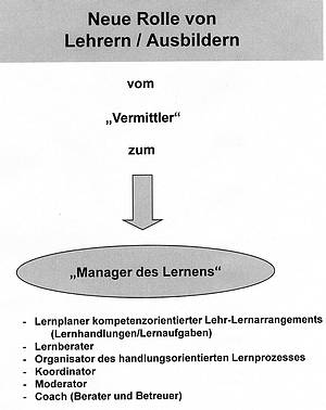 Die fachdidaktische Ausbildung ist besonders darauf gerichtet, den Paradigmenwechsel von der Vermittlungsdidaktik zur Didaktik des Lehr-Lernarrangements und das damit verbundene veränderte Rollenverständnis von Lehrenden und Lernenden zu verdeutlichen, was die Abbildungen 2 und 3 zeigen.