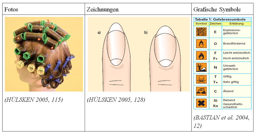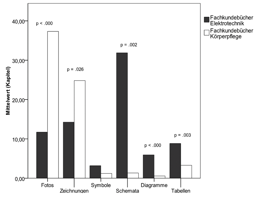 Zusammenfassend zeigen die Ergebnisse, dass die Bücher des Berufsfelds Körperpflege signifikant mehr Bilder mit geringerem Abstraktionsgrad, nämlich Fotos und Zeichnungen, enthalten als die Lehrwerke des Berufsfelds Elektrotechnik. Hingegen treten in den Elektrotechnik-Fachkundebüchern signifikant mehr Bilder mit hohem Abstraktionsgrad wie z.B. Schemata, Diagramme und Tabellen auf.