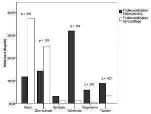 Der Vergleich der Fachkundebücher zeigt, dass in den Körperpflegelehrwerken signifikant mehr Fotos und Zeichnungen vorkommen als in den Lehrbüchern für das Fach Elektrotechnik. Während in den Körperpflegebüchern etwa 37 Fotos und 25 Zeichnungen pro Kapitel abgebildet sind, enthalten die Elektrotechnikbücher etwa zwölf Fotos und 14 Zeichnungen pro Kapitel. Beide Unterschiede sind statistisch signifikant (p < .001 und p = .026). Der Effekt, berechnet nach Cohens d (vgl. COHEN 1992) ist dabei für den Mittelwertunterschied der Fotos (d = 1.26) wesentlich größer als der für den Mittelwertunterschied der Zeichnungen (d = .61).