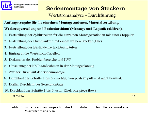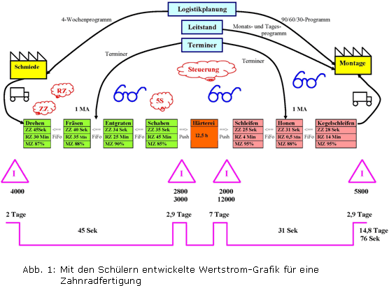Die Herwig-Blankertz-Schule Wolfhagen (Bereich Industriemechaniker/in) ist seit einigen Jahren an Modellversuchen beteiligt zur Entwicklung und Umsetzung einer arbeits- und geschäftsprozessorientierten Ausbildung. Im Volkswagenwerk Kassel werden zurzeit erhebliche Anstrengungen unternommen, um ein modifiziertes Modell eines G anzheitlichen P roduktions s ystems (GPS) einzuführen. Parallel dazu sollen Elemente des GPS in die berufliche Erstausbildung durch das Projekt GPS Komp (Kompetenzentwicklung für ganzheitliche und standardisierte Produktionssysteme) integriert werden. Das Projekt GPS Komp ist in die aktuelle Curriculumentwicklung an der Berufsschule eingebunden und es werden GPS-Elemente in den schulischen Lehrplan für Industriemechaniker aufgenommen. Das GPS-Element „Verbesserungsprozesse“ ist ein wesentlicher Baustein von Produktionssystemen und bietet sich daher für eine didaktische Umsetzung im Rahmen des Lernfelds „Optimieren technischer Systeme“ an, zumal hier neben der Förderung der Fachkompetenz auch verstärkt die Entwicklung von überfachlichen Kompetenzen angestrebt wird. Eine Methode zur Realisierung betrieblicher Verbesserungsprozesse stellt die Wertstromanalyse (value stream design) dar, die daher als ein zentrales Element zur Gestaltung eines Unterrichtsprojekts genutzt wird. Die Projekteinführung erfolgt durch die Wertstromanalyse einer betrieblichen Produktionslinie aus dem Bereich der Zahnradfertigung. Die didaktische Umsetzung der Optimierungsmethode Wertstromanalyse erfolgt durch eine modellhafte Serienmontage im Berufsschulunterricht.