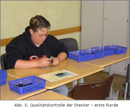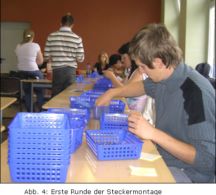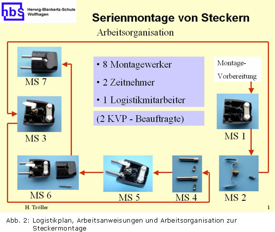 Am Anfang der Montagelinie steht ein Behälter mit den Gehäuseunterteilen der Stecker. Dann folgen die fünf Montagestationen, an denen leicht griffbereit die jeweiligen Montageteile zur Verfügung stehen. Zunächst werden jetzt die Montagestationen „aufgefüllt“, d. h. die Schüler jeder Montagestation führten jeweils ihren Montageschritt aus. Wenn alle fünf Stationen ihren eigenen Montageschritt abgeschlossen haben, kann jetzt die getaktete Montage der Stecker beginnen, indem der Schüler in der fünften Montagestation seinen fertigen Stecker in einen Behälter ablegt und einen nicht fertigen Stecker von der vierten Station zieht (pull). Nun erst zieht der Schüler der vierten Station sein Bauteil aus der dritten Station usw. Hat der Schüler der ersten Station kein Bauteil mehr vor sich liegen, entnimmt er dem Behälter ein neues Gehäuseunterteil und beginnt erneut mit seinem Montageschritt. Es durchläuft somit immer nur ein Stecker die Montagelinie (one piece flow) und es können sich keine Bestände in der Linie aufbauen.
