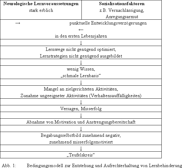 Zur Abgrenzung der Lernbehinderung von ähnlichen, aber graduell verschiedenen Konstrukten, z.B. der Lernstörung, muss ihrer Eigenschaft als Entwicklungsstörung, die sich in der Regel lebensgeschichtlich interaktiv und kumulativ „aufbaut“ und z.B. nach dem „Diathese- Stress-Modell“ (s.u.) beschreibbar ist, mehr Gewicht als bisher beigemessen werden. Dadurch gewinnen auch anamnestische Kategorien eine besondere Bedeutung.