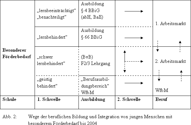 Der Personenkreis des bis 2004 so genannten „ Förderungslehrgang, Zielgruppe 2 “ (F2/3) dürfte sich weitgehend aus jungen Menschen mit diesen intellektuellen (und anderen) Voraussetzungen rekrutiert haben. (Die fünf unten stehenden Kriterien des Entscheidungskonzeptes „BvB-Reha-2“ erlauben eine klare berufsberaterische Entscheidung über die Zugehörigkeit von Rehabilitanden/innen zum Personenkreis schwer lernbehinderter junger Menschen.)