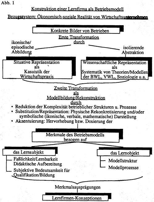 Der Begriff der Lernfirma, über dessen Akzeptanz erste positive Recherchen vorliegen (HERUD, J./LULL, A. U. a.), integriert u. a. die konzeptionellen Varianten der Übungsfirma und des Lernbüros. Lernfirma wird definiert als Organisationsform wirtschaftsberuflichen Lernens im Betriebsmodell. Die Konstruktion einer Lernfirma als Betriebsmodell ist dadurch gekennzeichnet, daß auf situative und wissenschaftliche Formen der Repräsentation von Betrieben zurückgegriffen wird. Die eigentliche Modellbildung und Rekonstruktion der Realität erfolgt durch die drei Maßnahmen der
