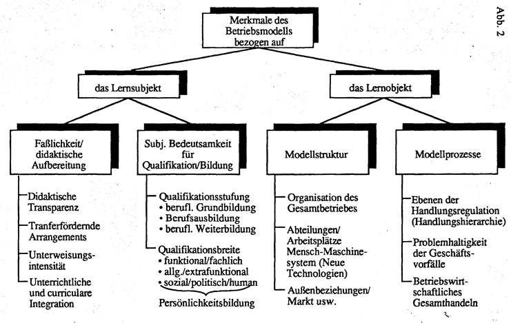 Schließlich ist von einer zweiten Gruppe lernsubjektbezogener Merkmale zu sprechen. Es handelt sich um Merkmale, die die Funktion des Betriebsmodells betreffen, nämlich die subjektive Bedeutsamkeit der Lernfirma für Qualifikation und Bildung des Lernenden. Entsprechend einem erweiterten Qualifikationsbegriff kann hier jeweils die Erreichbarkeit fachlich funktionaler Qualifikationen, allgemein/prozeßunabhängiger Qualifikationen sowie die Erreichung humaner und sozialer Qualifikationen als Kriterium gelten. Neben dieser Qualifikatjonsbreite ist die Qualifikationsstufung als Merkmal zu betrachten, ausgedrückt in Erreichbarkeitsgraden von beruflicher Grundbildung, Berufsbildung oder beruflicher Weiterbildung.