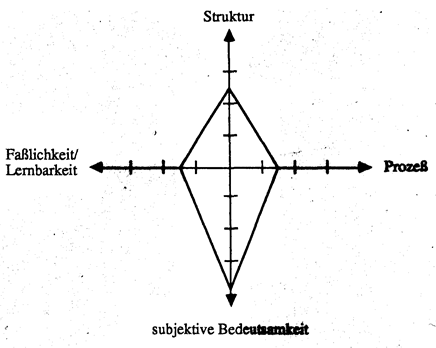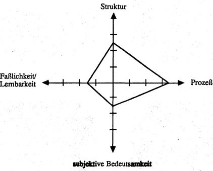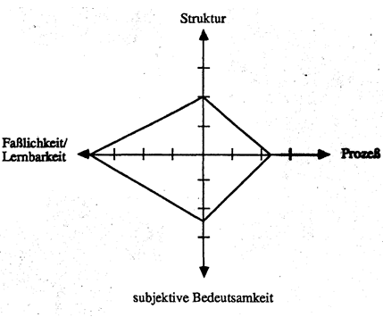 Diese kurze verbale Charakteristik der prozeßbetonten Konzeption enthält also einige interdependente Hypothesen, die sich auch geometrisch auf einem Koordinatensystem der vier Kriterien darstellen lassen. Da das Problem der Quantifizierung dabei noch nicht gelöst ist, hat die Zeichnung nur eine veranschaulichende Funktion: