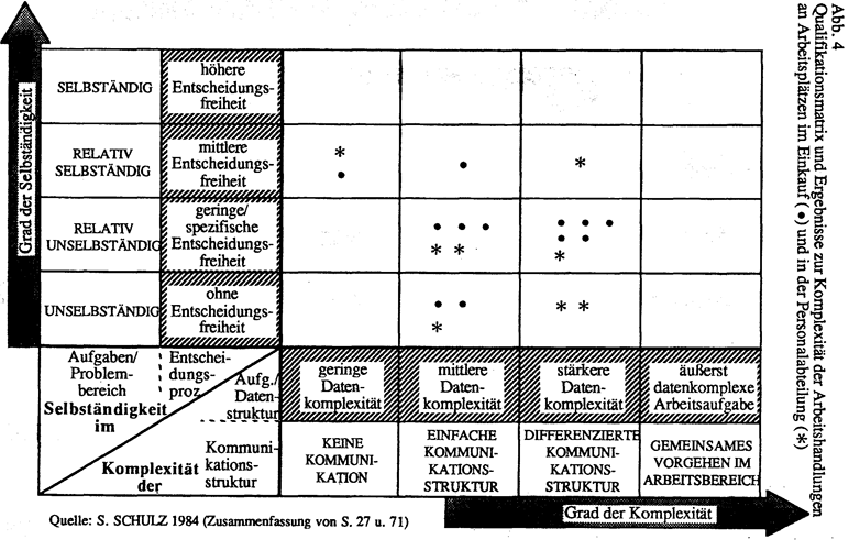Die ermittelten Werte ergaben sich aus Arbeitsplatz- und Aufgabenanalysen in den beiden Doppeldimensionen "Komplexität der Daten und der Kommunikation" sowie "Grad der Selbständigkeit und der Entscheidungsfreiheit". Die Untersuchungen betrafen die strukturell vorgegebenen Handlungsmöglichkeiten des Sachbearbeiters in den Abteilungen Einkauf und Personalabteilung im Rahmen der Ausbildung zum Bürokaufmann. Zur Komplexität der Arbeitshandlungen in der Personalabteilung ist zum Beispiel folgendes gesagt: