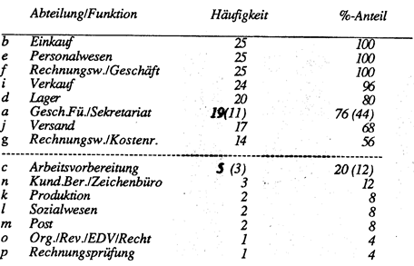 Die Standardabteilungen Einkauf, Verkauf, Personalwesen, Rechnungswesen/ Geschäftsbuchführung finden sich bei so gut wie allen Übungsfinnen. Gut 3/4 aller Übungsfirmen verfügen zusätzlich über die Funktionen Lager und Geschäftsführung/Sekretariat. Berücksichtigt man jedoch, daß 8 der 19 benannten Abteilungen für Geschäftsführung/Sekretariat zusätzlich als nur symbolisch repräsentiert deklariert werden, so sinkt der prozentuale Anteil dieser Funktion auf 44 %. Ohne Berücksichtigung dieser Einschränkung verfügen gut die Hälfte bis Zweidrittel aller Übungsfirmen zusätzlich zu den genannten Abteilungen über die Abteilung Versand und Rechnungswesen/Kostenrechnung.