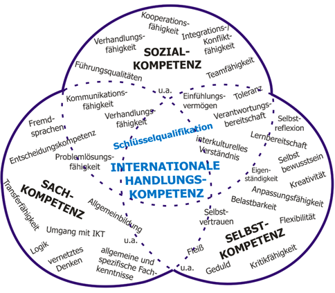- Sozialkompetenz: Fähigkeit und Bereitschaft zu Kommunikation und Kooperation mit internationalen KundInnen und KollegInnen (auch virtuellen Teams), Verhandlungsfähigkeit, Einfühlungsvermögen, Toleranz für andere kulturelle Verhaltensweisen und Werte, weltgewandtes Auftreten, sowie Integrations- und Konfliktfähigkeit.