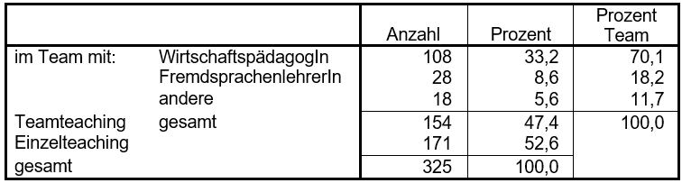 Im Rahmen der Befragung 2006 wurde zusätzlich erhoben, mit wem die Lehrenden im Team unterrichten. In 70,1 % der Fälle arbeiten zwei WirtschaftspädagogInnen zusammen, in 18,2 % ein/e Wirtschaftspädagoge/in mit einer/m Fremdsprachenlehrer/in. In 11,7 % der Fälle erfolgt die Zusammenarbeit mit anderen KollegInnen, wie beispielsweise PraktikantInnen, HauswirtschaftslehrerInnen, SozialpädagogInnen oder TextverarbeitungslehrerInnen.