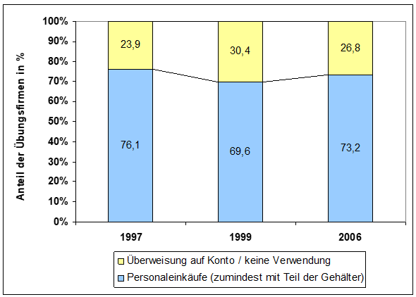 Die Verwendung der Gehälter dieser MitarbeiterInnen ist ebenfalls von Interesse, da die MitarbeiterInnen als KosumentInnen am Übungsfirmenmarkt auftreten und die private Nachfrage simulieren. Im Geschäftsjahr 2005/06 investierten 73,2 % der Übungsfirmen zumindest einen Teil der Gehälter über Personaleinkäufe wieder am Übungsfirmenmarkt. Der Vergleich zu den Jahren 1997 und 1999 ist in der nachfolgenden Abbildung dargestellt: