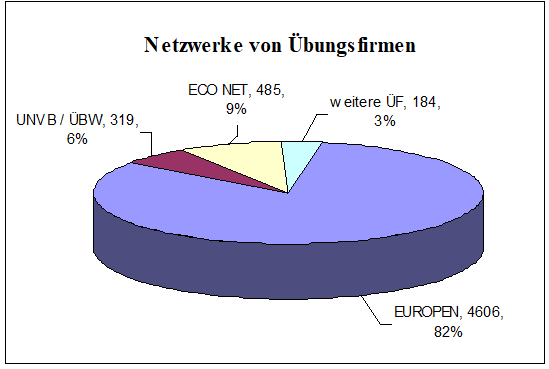 Zur Förderung der grenzüberschreitenden Geschäftstätigkeit und der Zusammenarbeit zwischen Übungsfirmen entstanden neben den nationalen auch internationale Netzwerke von Übungsfirmen. Weltweit waren im Mai 2006 etwa 5600 Übungsfirmen in überregionalen Netzwerken registriert. EUROPEN (European Practice Enterprises Network) ist das wichtigste Netz und hat ca. 4606 Übungsfirmen aus allen Kontinenten integriert. UNVB (United Networks of Virtual Business) – erweitert um das Netz der bayrischen Wirtschaftsschulen – verzeichnet insgesamt ca. 319 Mitglieder aus Mitteleuropa und ECO NET betreut ca. 485 schulische Übungsfirmen im südosteuropäischen Raum. Daneben gibt es einzelne nationale Übungsfirmenmärkte (z. B. in Hong Kong, Japan und Russland), die in kein überregionales Netzwerk eingebunden und in der folgenden Abbildung 3 unter weitere ÜF angeführt sind.[2]