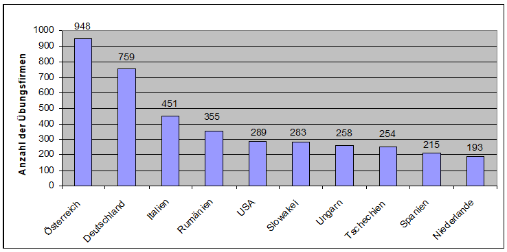 Die zunehmende Internationalisierung spiegelt sich auch am österreichischen Übungsfirmenmarkt wider, denn 241 der untersuchten 325 Übungsfirmen unterhalten mittlerweile internationale Geschäftsbeziehungen. Die Anzahl der ausländischen Geschäftspartner reicht von 1 bis 400. Im Durchschnitt schließen Österreichs Firmen mit knapp 10 ausländischen Übungsfirmen Geschäfte ab. Das entspricht fast einer Verdreifachung des Wertes aus 1999. Der Median liegt bei 4, folglich haben mindestens 50 % der befragten Übungsfirmen mindestens vier internationale Geschäftspartner.