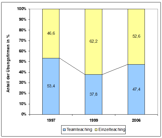 Die Lehrendenbefragung des Jahres 2006 zeigt, dass in Österreichs Übungsfirmen zwischen 4 und 60 SchülerInnen tätig sind. Der Mittelwert der SchülerInnenzahlen beträgt 16,68. Dieser Wert unterscheidet sich nur im Dezimalbereich von den Werten aus den Jahren 1997 und 1999, denn damals waren durchschnittlich 17 Personen beschäftigt. Die Anzahl der Lehrenden pro Übungsfirma unterliegt hingegen stärkeren Schwankungen. 2006 unterrichten 52,6 % der Lehrenden alleine und 47,4 % im Team. Dieses Verhältnis hat sich gegenüber dem Jahr 1999 zu Gunsten des Teamteachings verbessert, erreicht jedoch nicht den Wert aus 1997, wie die folgende Abbildung zeigt: