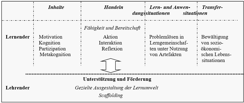 - Aktion (Bezug zum Individuum): Die Lernenden agieren, d. h. sie denken und organisieren selbst. Aktion setzt bei den Lernenden die Motivation und Fähigkeit voraus, sich in unterschiedlichen Lernaktivitäten in verschiedenen Kontexten zu engagieren und Lernprozesse weitgehend eigenverantwortlich zu planen, durchzuführen und zu bewerten. Damit sind vor allem anspruchsvolle kognitive Aktivitäten wie Anwenden, Analysieren, Verknüpfen, Beurteilen sowie kritisches Denken angesprochen, welche Verstehen voraussetzen und es den Lernenden ermöglichen, sich selbst laufend neues anwendungsrelevantes Wissen zu erarbeiten (DUBS 2000, 103).