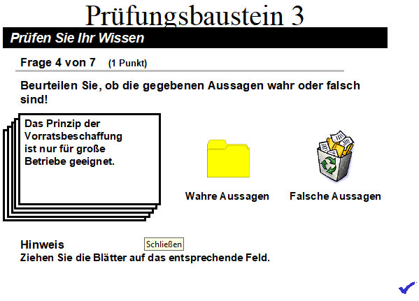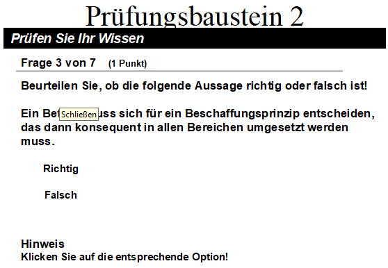 Auch dieses Beispiel ist für die praktische Entwicklung typisch. Nicht die didaktischen Anforderungen sind für die Gestaltung entscheidend, sondern die Möglichkeiten, computergestützt Antworten auszuwerten. Verwendet werden daher überwiegend „Multiple-Choice-Aufgaben“ und Lückentexte.