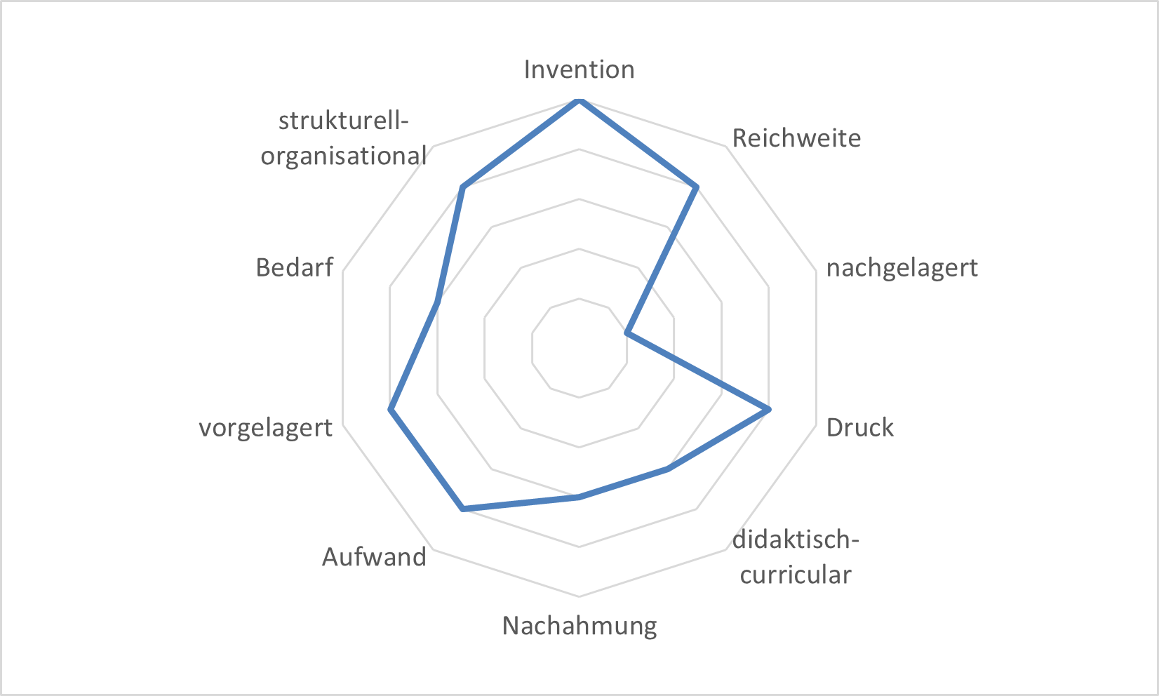 Die Ausprägungen in der Analysespinne sind zeitlich gebunden, d.h. je nachdem ob die sich in der Förderrichtlinie ausdrückende Intention des Mittelgebers, die tatsächlichen Vorhaben in den Projektanträgen auswertet oder ein Programm im Ergebnis vor Augen steht, ergeben sich unterschiedliche Bilder. Die Vermutung ist: Stimmen die Diagramme der Zielsetzung und der Zielerreichung überein, deutet dies auf eine spannungsfreie Realisierung des Programms hin – oder aber auf geringe Inventions- und/oder Nachahmungsambitionen. Umgekehrt zeigt eine fehlende Überschneidung zwischen Ziel und Erreichung, dass die gewünschte Veränderung kaum in der Praxis ankommt. Ein Abgleich der Spinnenprofile zu den verschiedenen Zeitpunkten mag somit auch für die Programmevaluation nützlich sein.