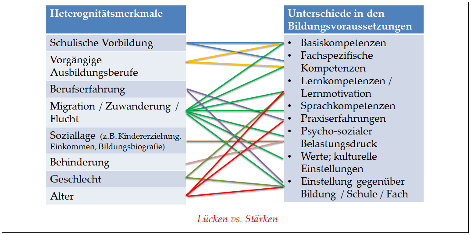 „Heterogenität“ wird in Bildungsinstitutionen zugleich als Realität und Herausforderung wahrgenommen. Dabei ist das Konstrukt zunächst noch vage und unbestimmt. Häufig wird Heterogenität auf die kognitiven Leistungen von Lernenden reduziert und insbesondere in der schulischen Praxis als Begründung für die Separierung in ein mehrgliedriges Schulsystem, Klassenwiederholungen, Überweisungen auf Förderschulen oder Abschulung in eine andere Schulform verwendet. Das Bemühen um die Aufrechterhaltung von homogenen Lerngruppen trug dabei wesentlich zu der konstatierten Bildungssegregation bei. Heterogenität wird heute als ein mehrdimensionales Konstrukt verstanden. In der Literatur finden sich zahlreiche Differenzierungs- und Systematisierungsansätze. So unterscheiden beispielsweise Schuetze & Slowey (2012) die folgenden Dimensionen: kognitive Heterogenität (z.B. Wissen in einer Fachdomäne); soziale Heterogenität (z.B. Migrationshintergrund, familiäre Lage); heterogene Bildungserwartungen (z.B. Bildungsaspiration); motivationale Heterogenität (z.B. Lern-/Leistungsmotivation); heterogene Lebenslagen (z.B. soziales und kulturelles Kapital). Nicht jede Form der Heterogenität begründet eine Benachteiligung: Unterschiedliche Augenfarben, Hobbys oder Musikpräferenzen von Auszubildenden führen beispielsweise nicht zu unterschiedlichen Chancen auf einen erfolgreichen Ausbildungsabschluss. Wesentlich sind hingegen solche sozialen Merkmale, bei denen Vielfalt zur Benachteiligung werden (kann). So begründet beispielsweise ein fehlender oder niedriger Schulabschluss für einzelne Auszubildende Lücken in bestimmten Kompetenzbereichen (z.B. Mathematik), die sie gegenüber Mitlernenden mit einem höheren Schulabschluss benachteiligen. Jugendliche mit Migrationshintergrund, in deren Familie primär die Herkunftssprache gesprochen wird, die jedoch hohe Bildungsaspirationen verfolgen, treten mit sprachlichen Lücken und zugleich mit einer hohen Lernmotivation in eine Ausbildung. In einer Fachschule können ältere Lernende zum einen mit ihrer Berufserfahrung einen Vorteil gegenüber jüngeren Lernenden besitzen, sich zugleich aber nach Jahren der Berufspraxis mit einer schulischen Lernrhythmik schwertun. Die Beispiele zeigen, dass Heterogenität im Hinblick auf unterschiedliche Merkmale für eine Person zugleich Lücken und Stärken begründen kann. Insofern ermöglicht der Blick auf die Heterogenität von Lerngruppen neben der Defizit- auch eine Potenzialbetrachtung.