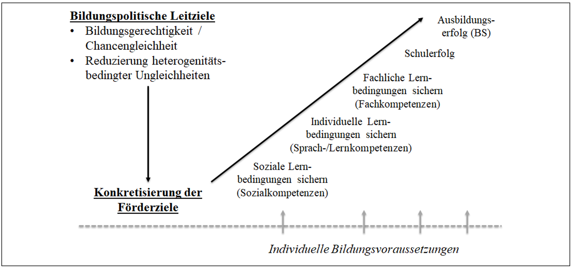 - Eine typologische Differenzierung der Förderziele unterscheidet zwischen der Sicherung sozialer Lernbedingungen (Sozialkompetenzen), individueller Lernbedingungen (Sprach-/ Lernkompetenzen) und fachlicher Lernbedingungen (Fachkompetenzen).