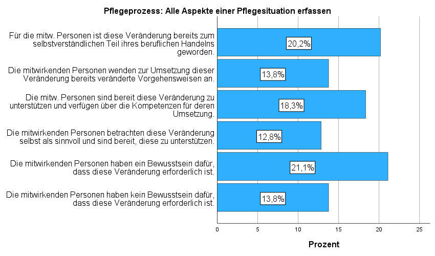 Der Grad der Umsetzung der vorbehaltenen Tätigkeit der Pflegeprozesssteuerung im Rahmen der Ausbildung wird mittels zwei Aspekten beleuchtet: Die eigenverantwortliche Anpassung des Pflegeprozesses an situative Gegebenheiten einerseits und die Berücksichtigung aller Aspekte einer Pflegesituation andererseits – jeweils bezogen auf die und im Rahmen der Ausbildung.