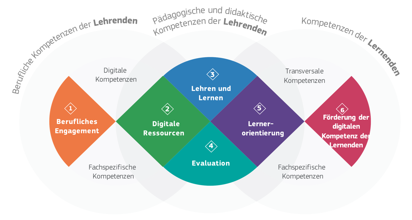 Abbildung 1: Bereiche und Dimensionen des DigCompEdu (Redecker 2017).