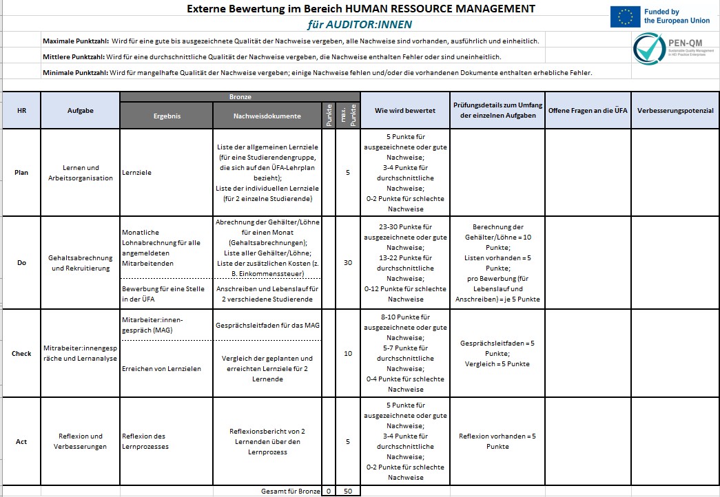Das Ende 2024 erfolgreich abgeschlossene Erasmus+ Projekt PEN-QM: Sustainable quality management – to foster future-proof job skills of HEI learners knüpft an den Gedanken des Audits als Lernanlass und als Quelle von Feedback zum Zweck der konzeptionellen und persönlichen Weiterentwicklung an und erweitert die geographische Reichweite auf den europäischen Raum und darüber hinaus. Die Projektergebnisse sind dabei nicht in Konkurrenz zu bestehenden nationalen Qualitäts-Audits zu sehen, sondern fokussieren klar auf die Unterstützung länderübergreifender Auditprozesse unter Beachtung der entsprechenden Besonderheiten. Ziel der 2022 gestarteten Initiative war es, den „Prozess zur Qualitätsentwicklung europaweit auf Übungsfirmen umzulegen und die Möglichkeit zu bieten, sich in Bezug auf eine qualitätsvolle Übungsfirmenarbeit zertifizieren zu lassen“ (Riebenbauer & Haupt, 2023, S. 7). Weiters war es der Anspruch des Projekts, Übungsfirmen über ihre Ländergrenzen hinaus in einen Dialog über qualitätsvolle Übungsfirmenarbeit treten zu lassen und „umsetzungspraktisch mit neuen Formen von Übungsfirmenarbeit zu experimentieren, die tatsächlich ein proaktives ökonomisches Agieren ermöglichen und fordern“ (Neuweg et al., 2008, S. 14).