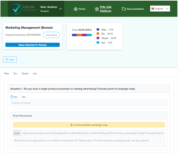 Zusätzlich zur analogen Nutzung der entwickelten Ressourcen zur internen und externen Evaluation von Übungsfirmen, wurde im Rahmen des Projekts außerdem eine Online-Plattform zur Abwicklung des Auditprozesses (siehe Abbildung 2) entwickelt und anschließend in die Projektwebsite eingebunden. Übungsfirmen können sich mit den Zugangsdaten ihrer nationalen Zentralstelle auf der Plattform kostenlos anmelden und dort den Auditprozess Schritt für Schritt durchlaufen. Die Fragebögen und die dahinterliegenden Kriterien samt Punktesystem wurden auf der Plattform hinterlegt, was ein intuitives Bewegen durch die einzelnen Schritte des Prozesses ermöglicht. Lehrende können den Prozess für ihre Übungsfirma starten, indem sie ein Audit für ein bestimmtes Feld in einer bestimmten Stufe beantragen. Durch einen Code erhalten die Lernenden anschließend Zugang zur Plattform und durchlaufen selbstständig die interne Evaluation anhand der festgelegten Kriterien des Fragebogens (siehe z. B. Abbildung 4). Nach Abschluss der internen Evaluation erhalten die Lehrenden die gesammelten Antworten und Dokumente zur Überprüfung und können entscheiden, ob die Angaben nochmals überarbeitet werden müssen, oder bereits ausreichend sind. Danach ist das interne Audit abgeschlossen (PEN-QM, 2024b, S. 1–9).