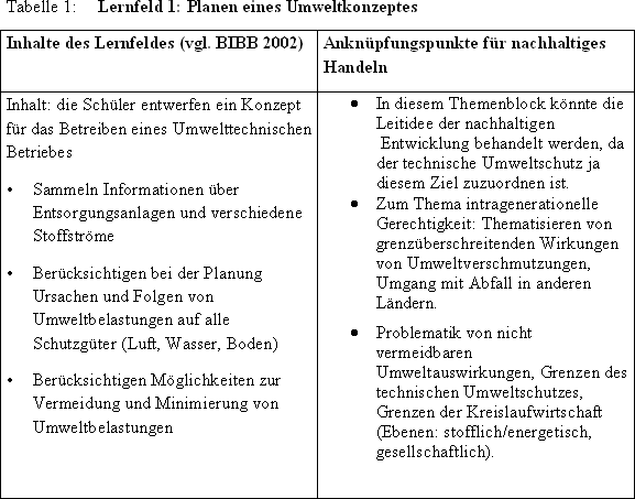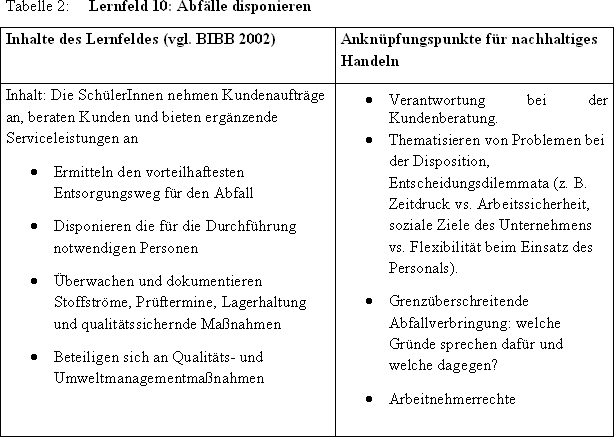Dieser Ausbildungsberuf wurde aus mehreren Gründen ausgewählt. Zum einen handelt es sich um ein neu gestaltetes Berufsbild, der Rahmenlehrplan wurde 2002 völlig neu gestaltet. Daher kann von einer inhaltlichen Aktualität der Lernfelder ausgegangen werden. Zum anderen bietet sich hier der Vorteil, dass technischer Umweltschutz in praktisch allen Ausbildungsinhalten eine Rolle spielt. Dies ist ein Vorteil, da so bei der Analyse der Lernfelder und der Suche nach Anknüpfungspunkten zur Thematisierung von Nachhaltigkeit der Gefahr begegnet wird, ausschließlich die Themen technischer Umweltschutz und Arbeitsschutz in den Blick zu nehmen. Diese Verengung der Thematik (gelegentlich mit dem spöttischen Begriff „Abfallbildung“ bezeichnet) fand oft in früheren Forschungsarbeiten zu dieser Thematik statt (vgl. MERTINEIT/ NICKOLAUS/ SCHNURPEL 2001). Schließlich kann vermutet werden, dass es von Vorteil ist, dass die Auszubildenden durch ihre praktische Arbeit ständig mit den Auswirkungen der Abfallentsorgung konfrontiert und daher für eine ganzheitliche Betrachtung dieser Thematik sensibilisiert sind.
